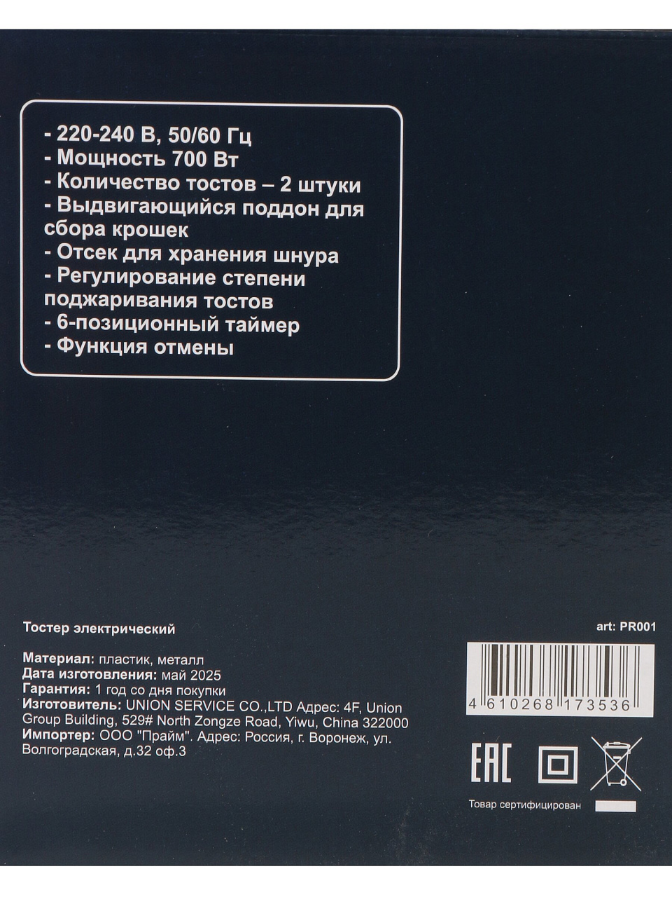 Тостер Lofter, пластик, 700 Вт, 6 степен прожар, PR001