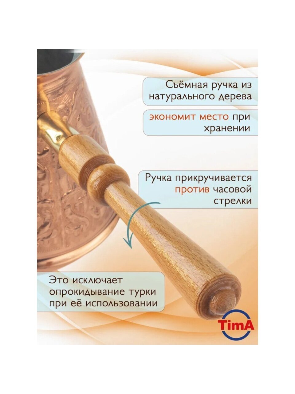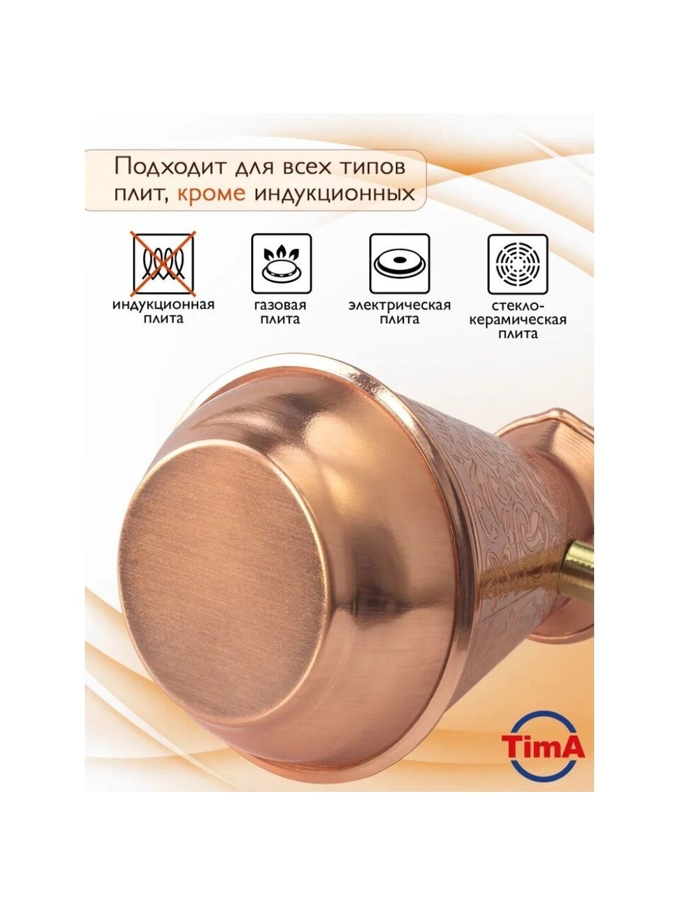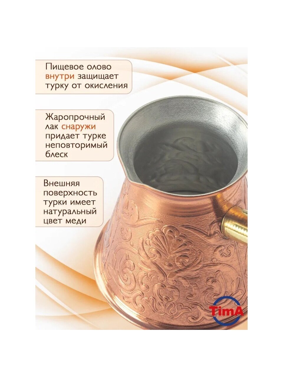 Турка для кофе TimA создана специально для приготовления великолепного кофе по-восточному. С ней Вы сможете насладиться чашкой ароматного и вкусного кофе. Медная турка покрыта жаропрочным лаком, что придает ей невероятный блеск.