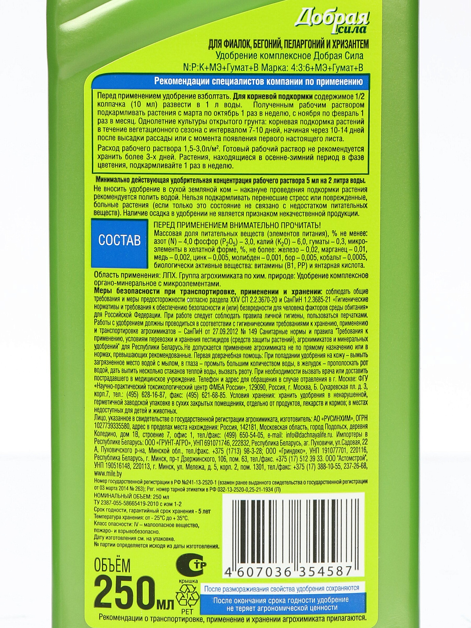 Добрая сила — это минеральное жидкое удобрение, созданное специально для фиалок и бегоний. Жидкая форма обеспечивает равномерное питание и быстрое действие, а фасовка 250 мл удобна для длительного использования.