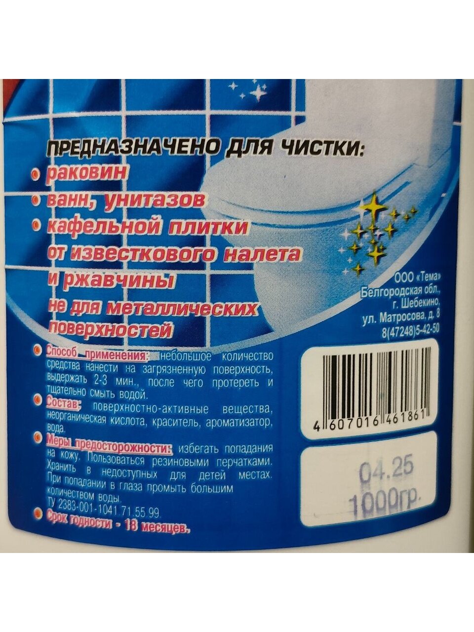 Чистящее средство "Экспресс Санитарный" для очистки наружных поверхностей сантехники, душевых кабин, унитазов,фаянсовых раковин, акриловых и эмалированных ванн от мыльных разводов, отложений солей жесткости, известкового налета, ржавчины.