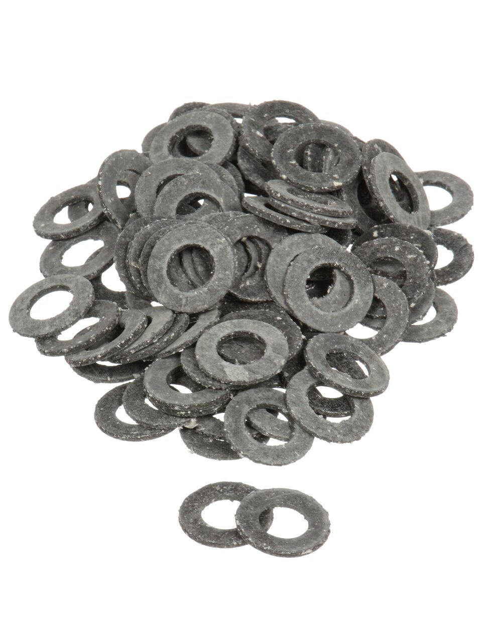 В комплекте 100 прокладок, каждая размером 14х24 мм, диаметр подключения 3/4", цвет — серый, материал — паронит.