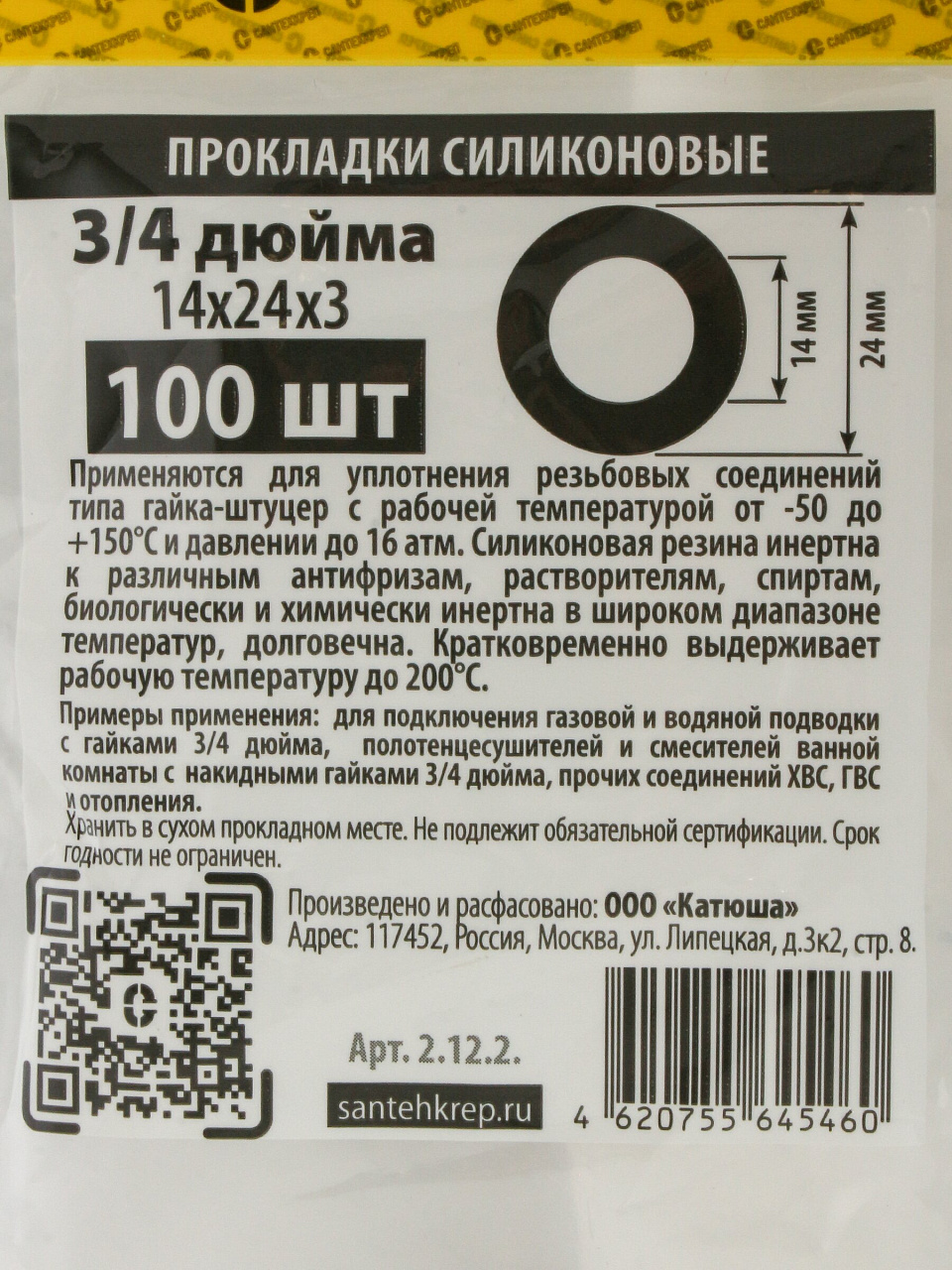Вы можете приобрести «Прокладка уплотнительная 100 шт, 3/4", 14х24х3 мм, силикон, СантехКреп, 2.12.2.Ф» и другие товары в нашем интернет-магазине в Таганроге по низким ценам и с бесплатным самовывозом.