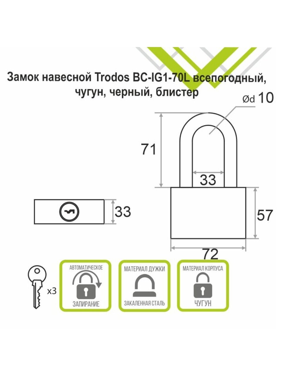 Вы можете приобрести «Замок навесной Trodos, BC-IG1-70L, 210 218, блистер, навесной, дисковый, всепогодный, черный, всепогодный, 3 ключа» и другие товары в нашем интернет-магазине в Смоленске по низким ценам и с бесплатным самовывозом.